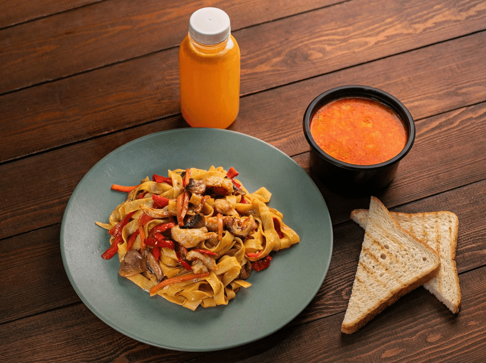 Суп Том Ям с курицей Фетучини с креветками в сливочном соусе Морс облепиха 0.3мл Два поджаренных тоста