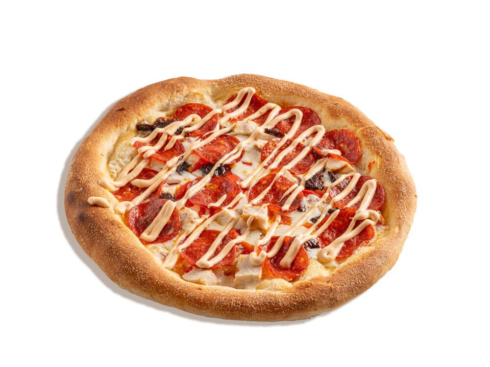 Ароматная пицца с насыщенным вкусом, украшенная кусочками моцареллы и колбасками чоризо. Курица и красный лук придают блюду мягкость, а перец и томаты добавляют пикантности. Соусы пицца и бургер гармонично дополняют это сочетание.