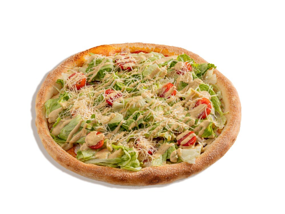Погрузитесь в мир вкусов с нашей пиццей, где нежная моцарелла и сочная курица гармонично сочетаются с фирменным соусом «Цезарь», а свежесть салата и сладость томатов черри создают неповторимое сочетание на фоне хрустящего теста.